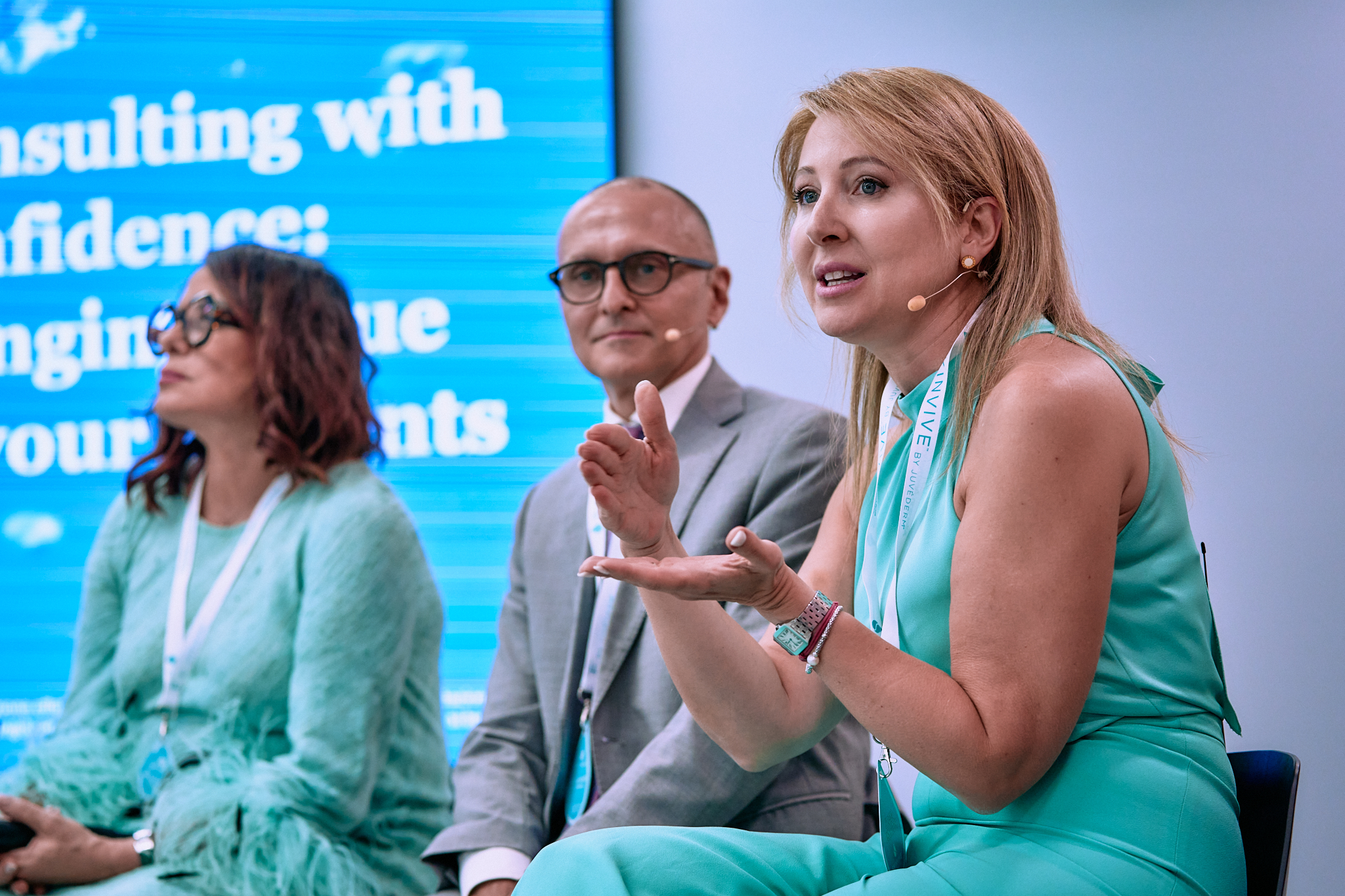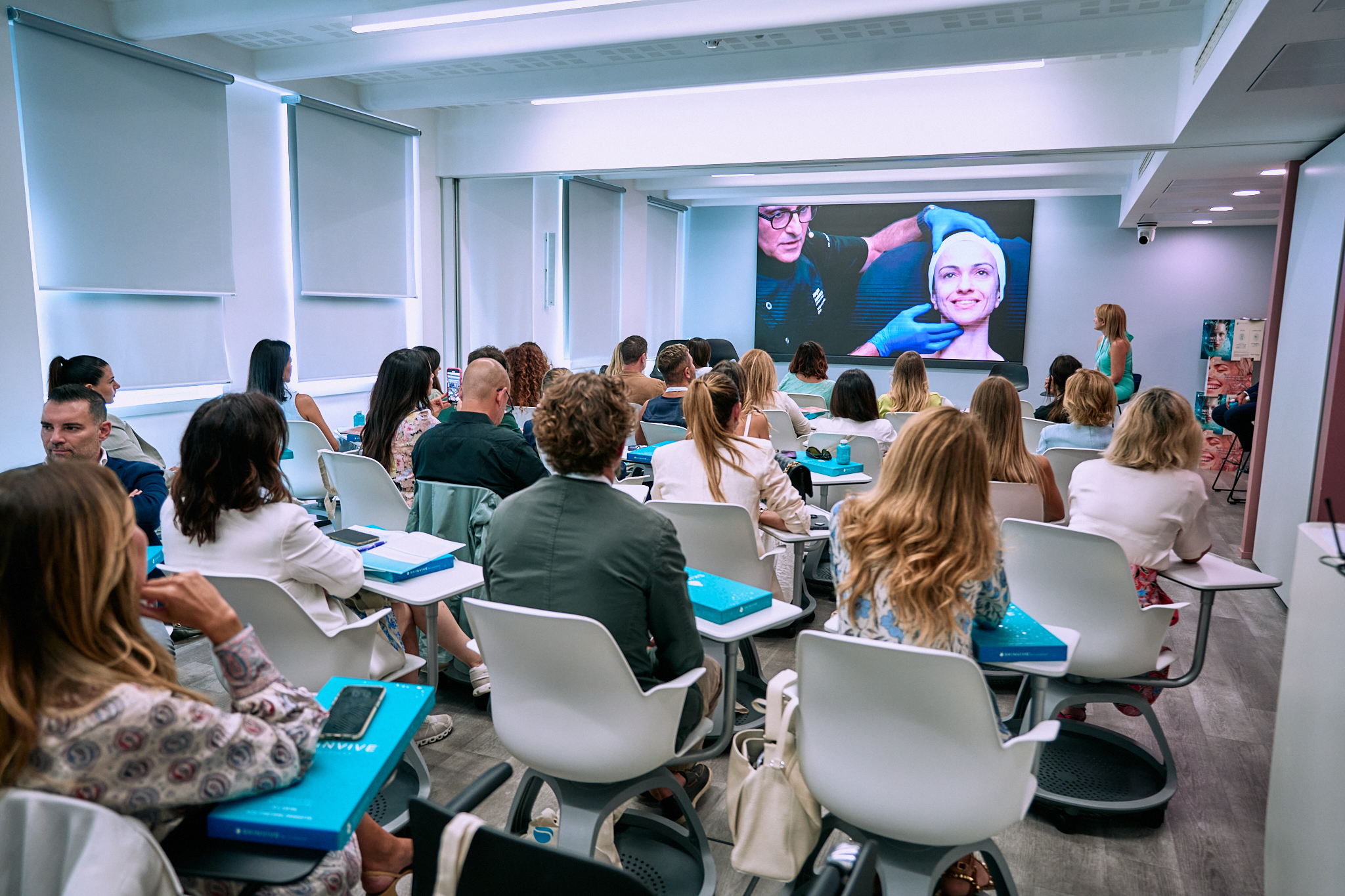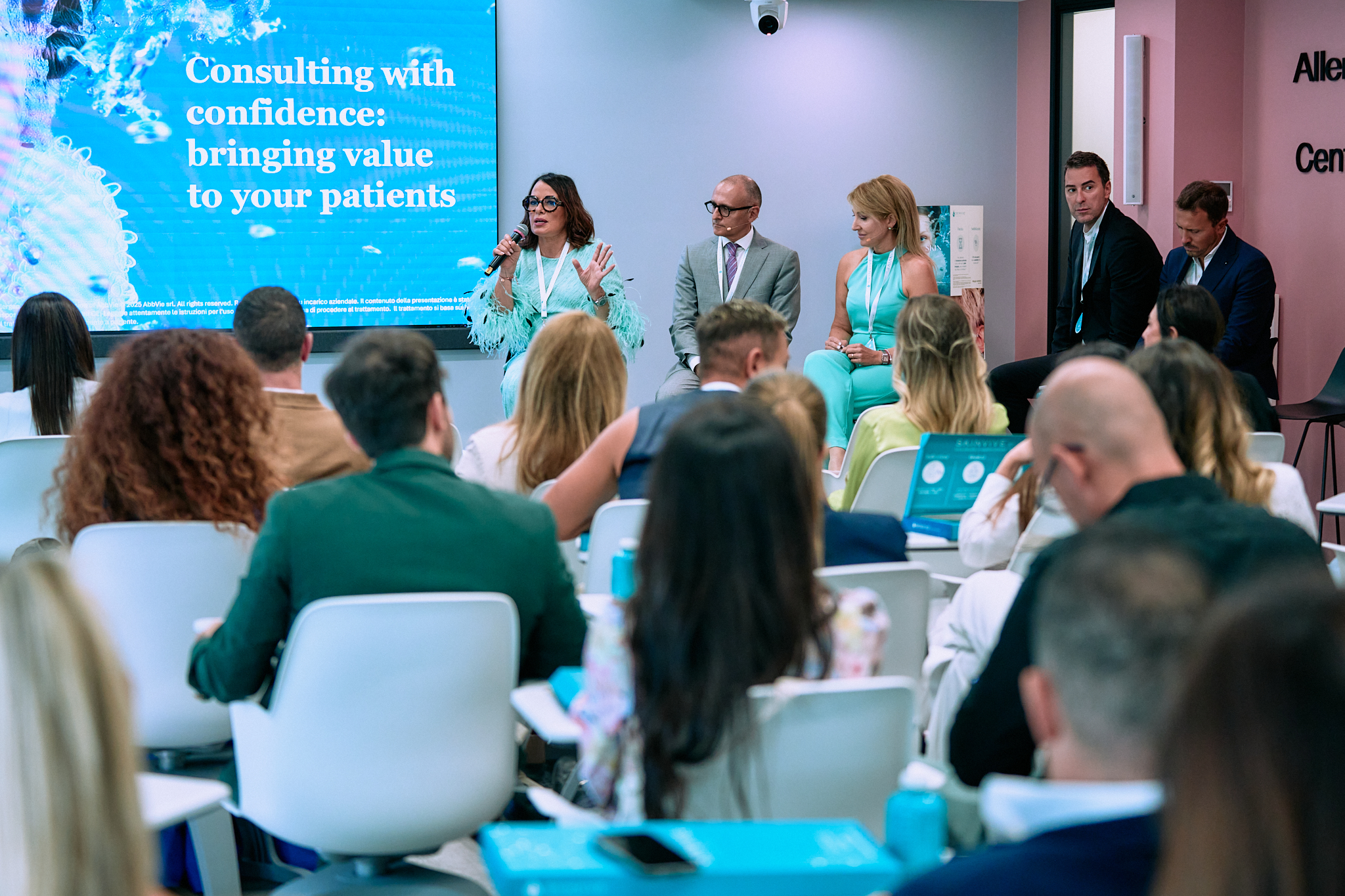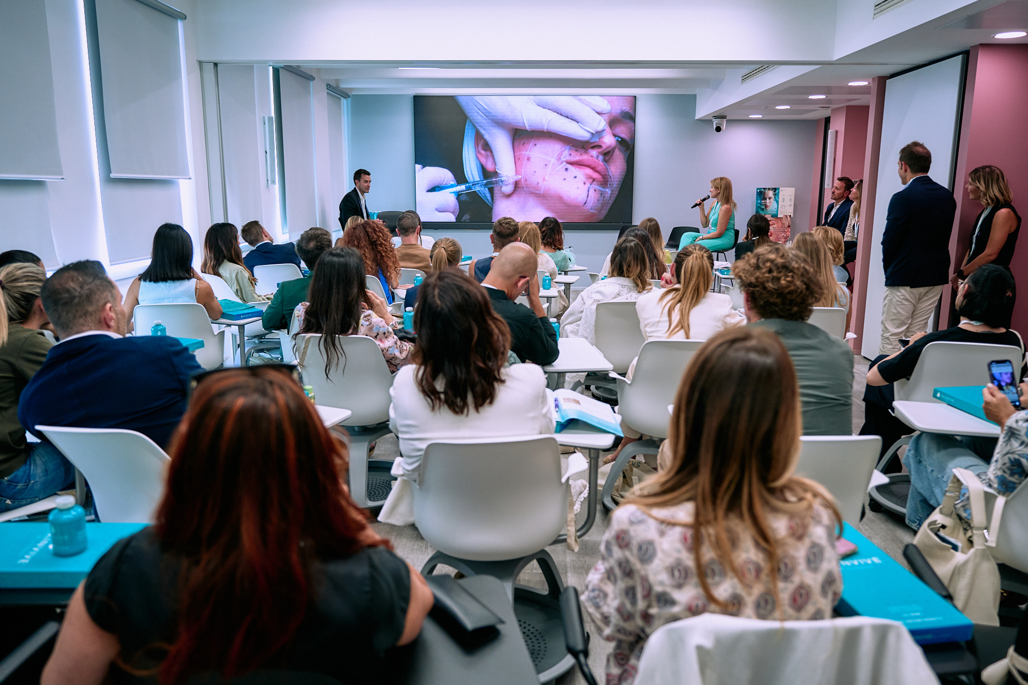 In seguito ha svolto il ruolo di medical injector, illustrando la tecnica di trattamento della pelle del viso prevista dai nuovi protocolli e commentando con i colleghi le caratteristiche e i meccanismi di azione del dispositivo e rispondendo alle domande dei colleghi in sala.